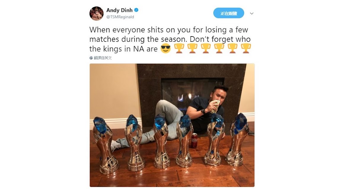 Team SoloMid(TSM)戰隊的老闆Reginald,稍早在推特上貼出一張照片,並附文道「When everyone shits on you for losing a few matches during the season. Don't forget who the kings in NA are.」(不過輸了幾場賽事後就看衰我們的人,別忘了誰才是真正的北美賽區王者。)