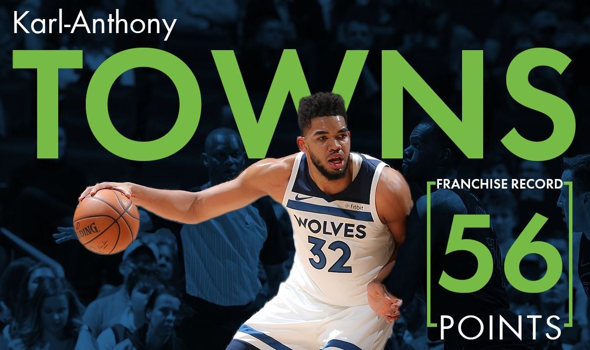 在《絕地求生》練了一整晚手感的唐斯,本場比賽單場砍進56分,不僅是個人新高,更是破了隊伍紀錄。 圖:翻攝自 Timberwolves Twitter