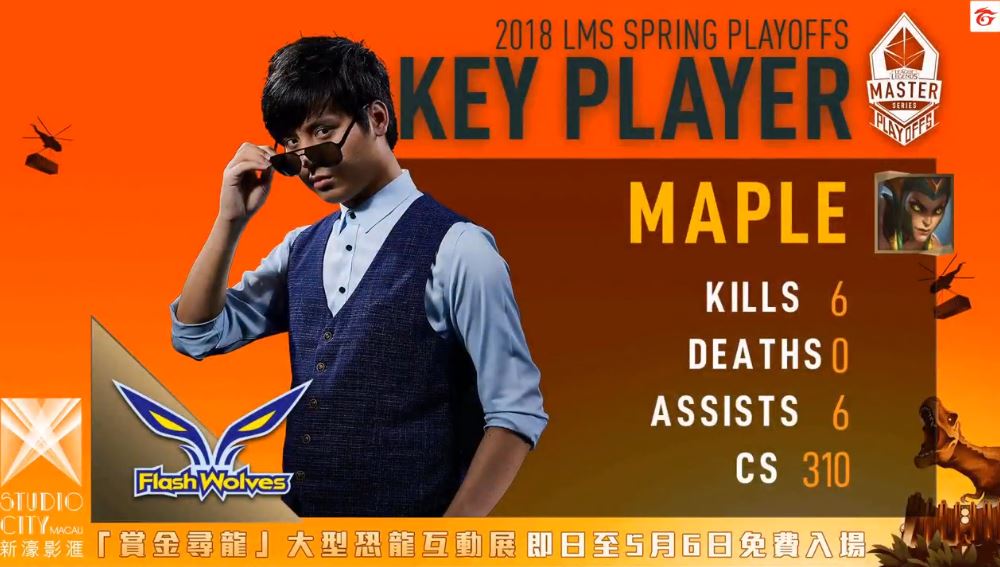 台港澳LMS賽區春季決賽今(22)日登場!由常規賽排名第一的閃電狼對上打贏冒泡賽的GRX。第一局,閃電狼Maple大殺四方加上SwordArt完美觀念,團隊會戰運營整體高出GRX一截,閃電狼率先拿下一場。