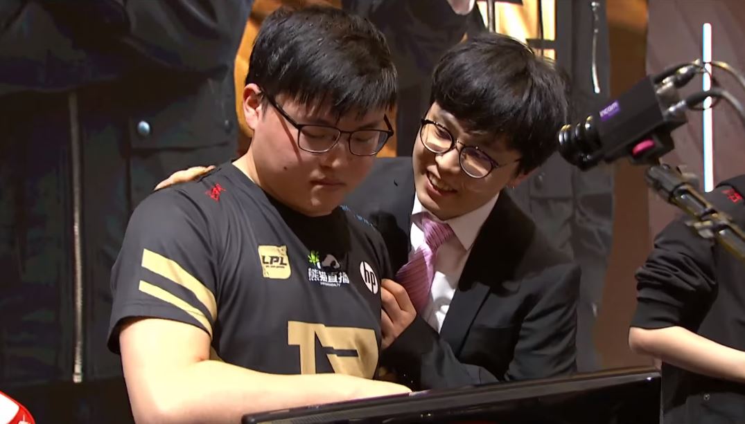 Heart教練在昨晚賽後摸了中單選手Xiaohu一把。 圖:翻攝自 LPL 官方影片