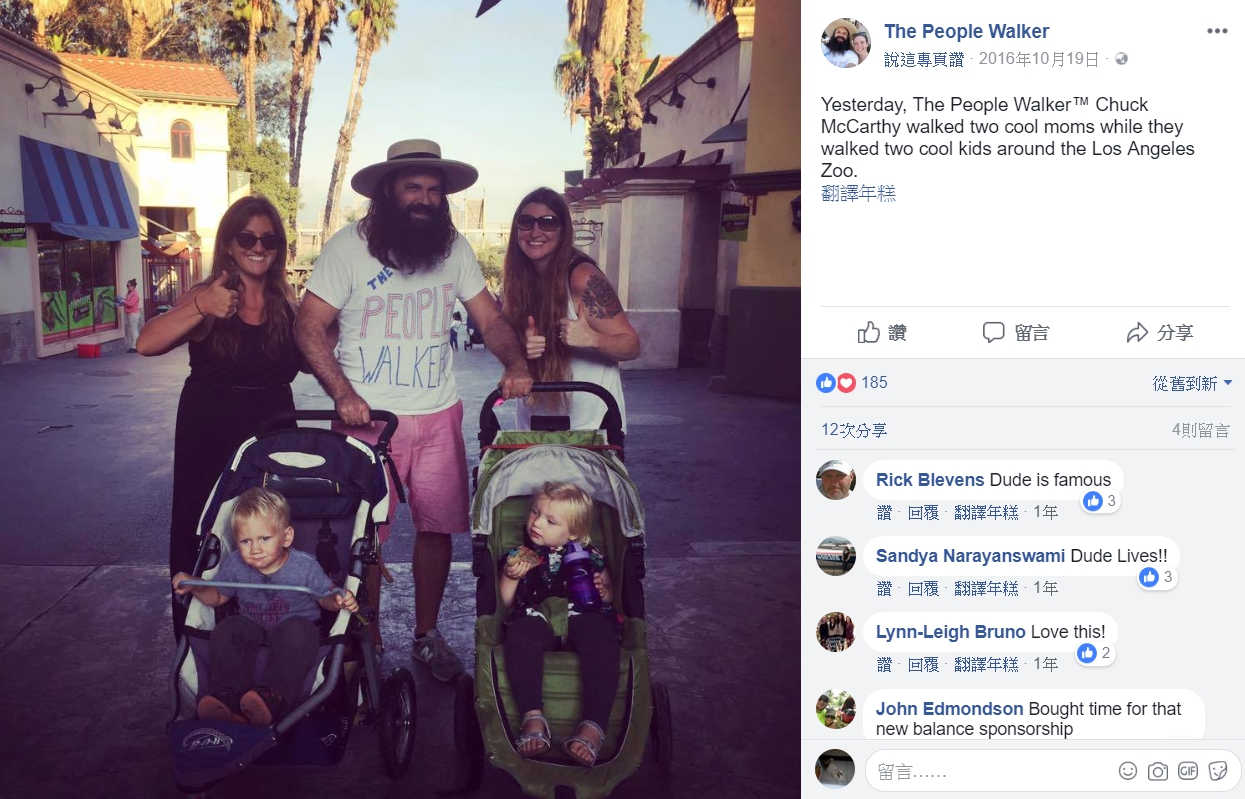 在這忙碌的時代,花錢請人遛狗已經不稀奇了,洛杉磯最近出現了「遛人」(People Walker)服務,一個小時30美元(約台幣900元),提供那些沒有動力出門、想運動或出門但不想一個人的人一個新選擇。 圖:翻攝自The People Walker