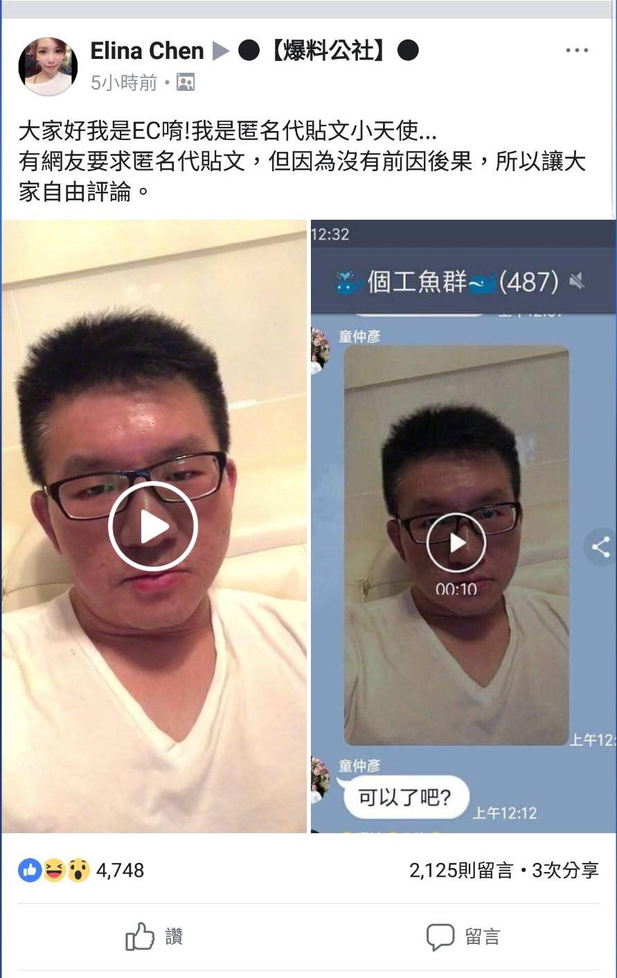 台北市議員童仲彥竟在性交易群組上傳自拍片!照片顯示LINE群組「個工魚群」聊天室內,童仲彥上傳一段10秒影片,童仲彥在影片中說「個工魚群的魚們,不要躲啦,這真的是我,不要怕」,現身力挺個工的勇氣,不禁讓網友大讚「這才是真男人!」