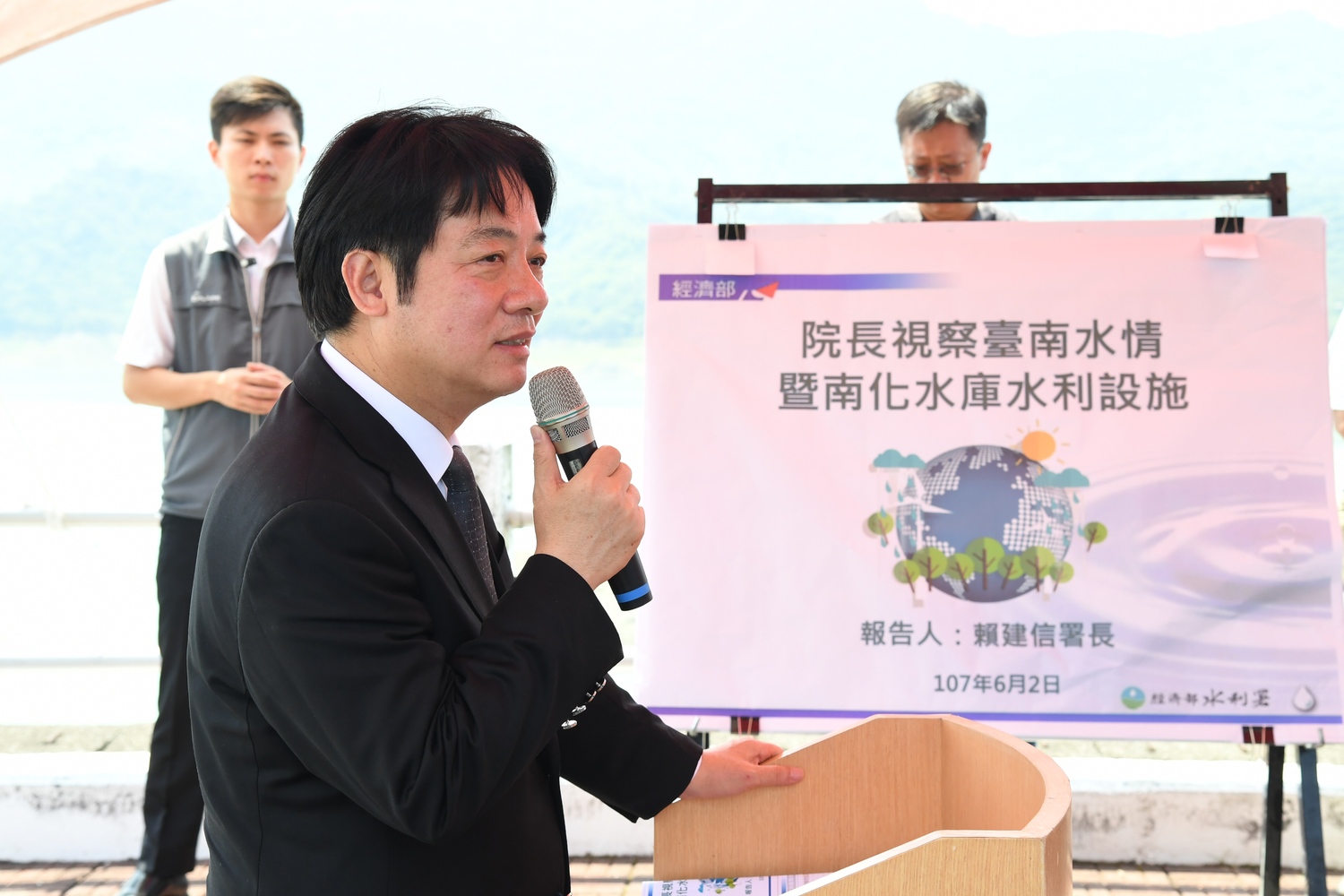 賴清德表示,今天到台南視察水情,主要有三個目的:第一,6月6日水利節即將到來,祝賀全台水利人佳節快樂,感謝大家辛勞,並期勉同仁再接再厲。第二,希望安定民心。台南市水資源在明日農業一期稻作灌溉完畢後,還有兩個月的水量可用於民生與產業,因此請台南市民不要恐慌,也不要儲水,以免造成統一調度困難。第三,籲請民眾珍惜水資源,建立長久的生活習慣。