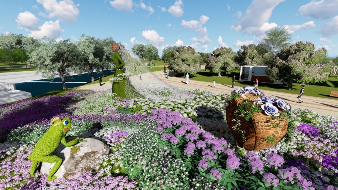 2018台中世界花卉博覽會豐原葫蘆墩園區的「愛戀童話區」,結合花藝與景觀設計,邀請國際花藝大師郭智鎧,運用婚禮佈展經驗,打造浪漫的新娘嫁紗花海,搭配綠雕青蛙,營造出童話般的故事意象,使展區充滿幸福與喜悅。