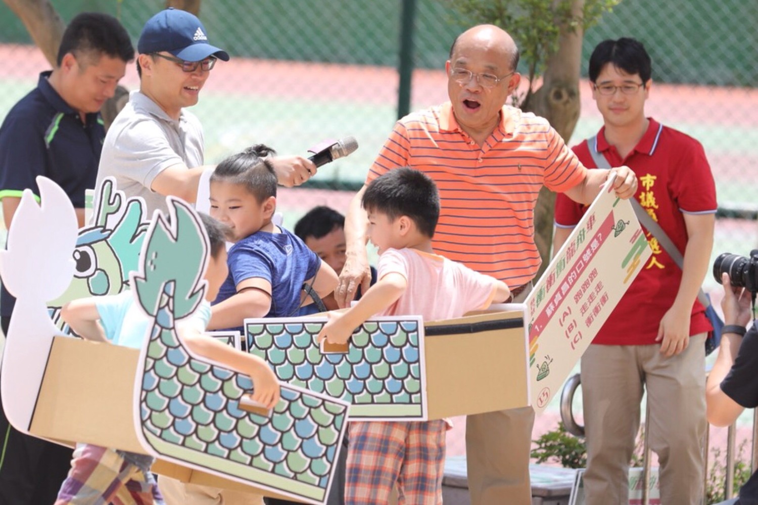 蘇貞昌一到場,就逐ㄧ跟小朋友們擊掌加油,更親自擔任陸上龍舟賽關主。蘇貞昌詢問小朋友自己最常說的口號是什麼,小朋友們大呼「衝衝衝」賣力奔回終點。活動現場除了有陸上龍舟PK賽、DIY跑跑氣球龍舟車外,現場還準備人氣超夯的「衝衝衝衝油餅」、「吉吉吉雞蛋糕」,一出爐就被小朋友們一搶而空。蘇貞昌最後頒發超受歡迎的發光籃球給贏得陸上龍舟賽的兩組小朋友,期許大家能在自己喜歡的領域裡發光發熱。