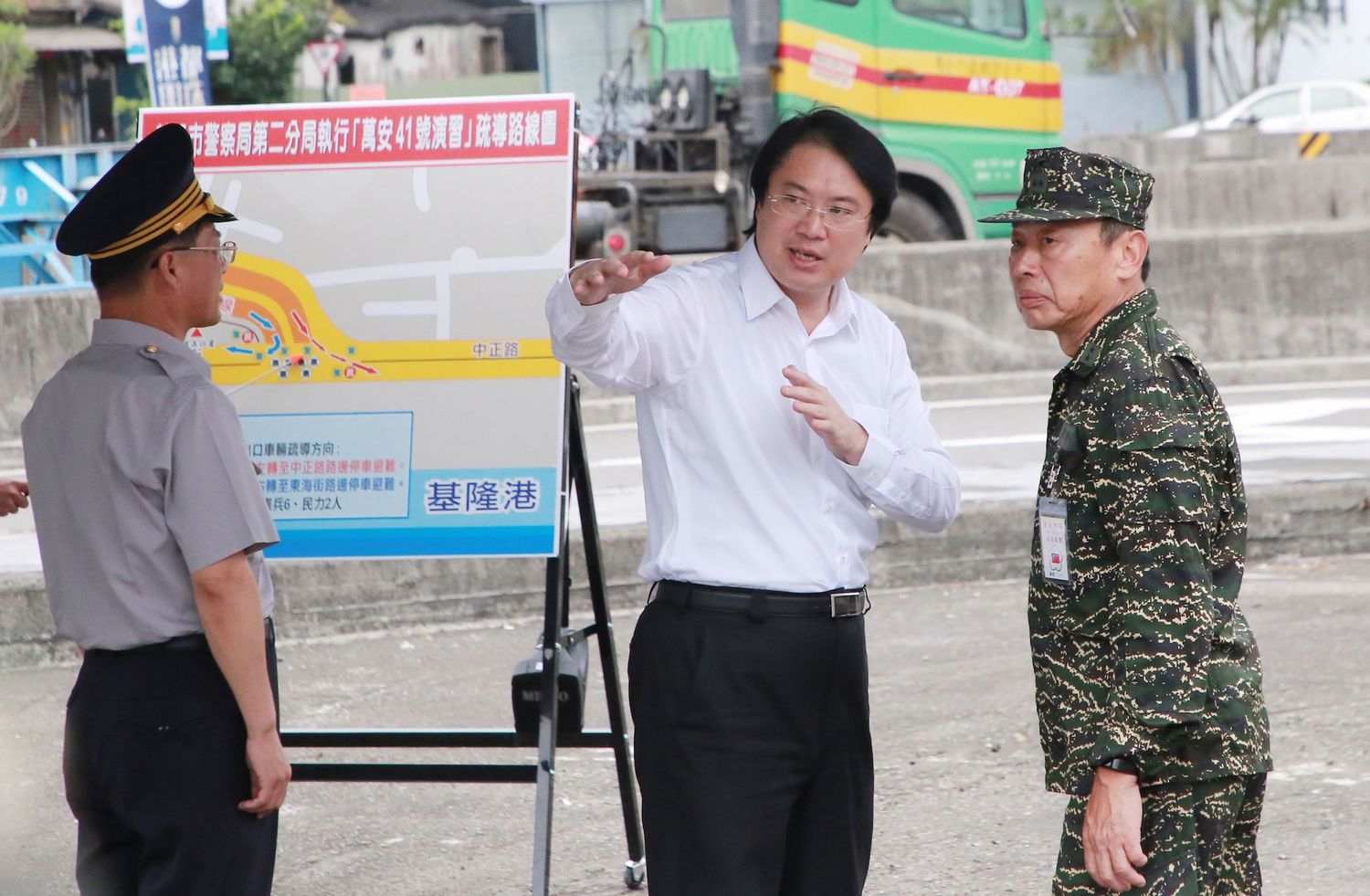 萬安41號軍事演習登場,基隆市長林右昌前往視察防空避難及交通管制疏導演練。 圖:基隆市政府 / 提供