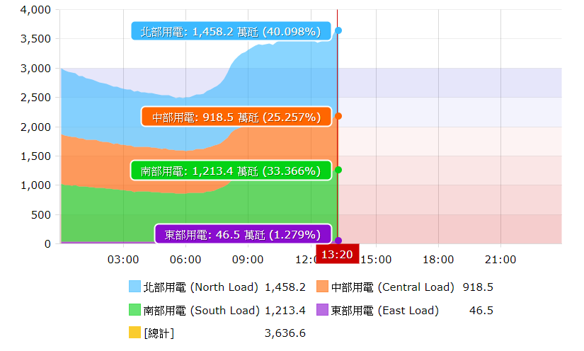 今天下午1點20分全台用電量達到3636.6萬瓩。