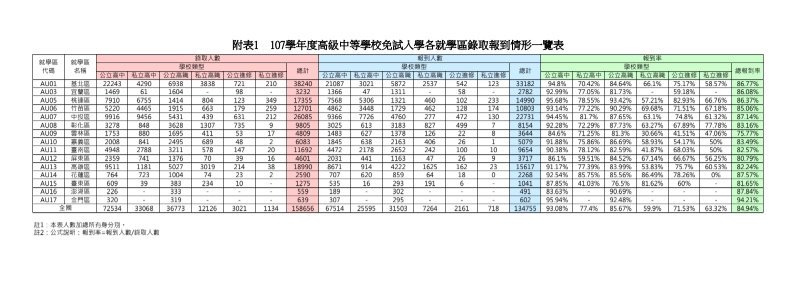 107學年度全國15個就學區高級中等學校分區免試入學管道業已於昨日完成錄取報到作業,今(14)日,教育部公布了各學區的學生的報到情形,總計各就學區總錄取人數為15萬8,656名,完成錄取報到之新生人數為13萬4,755名;全國報到率為84.94%。