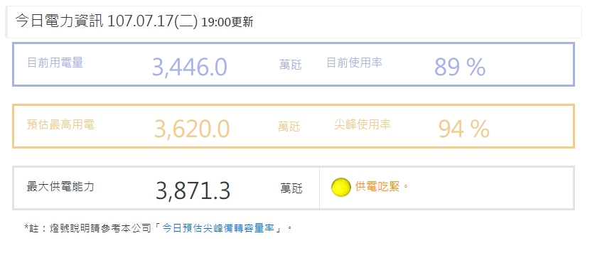 歷年7月用電量前10高紀錄分別是:2017年7月2日 3621.28萬瓩、2018年7月17日 3619.97萬瓩、2016年7月28日 3619.91萬瓩、2017年7月26日 3619.86萬瓩、 2017年7月24日 3614.80萬瓩、2017年7月21 日3614.56萬瓩、2017年7月18日 3610.66萬瓩、2017年7月19日 3604.55萬瓩、2016年7月29日 3598.71萬瓩、2017年7月20日 3597.27萬瓩。
