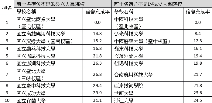 學生團體也拿教育部公開的「106學年度大專校院學生宿舍概況」來做說明,結果顯示全台大專院校的宿舍充足率僅55.5%。公立院校和私立院校各有18間和32間宿舍充足率不到50%。他們強調,從這個結果看的出來,大學宿舍不足的問題不僅僅只是少數大學的問題,也不只是私立大專院校的問題。其中問題最嚴重的兩所學校是國立臺北商業大學(臺北校區)和中國科技大學(臺北校區),連一間學生宿舍都不提供。宿舍數量不足、居住權益受損就是全台大專學生的共同處境,也是全台大專院校和教育部應立即處理的問題,宿舍不足對全國的大學生來說,只是嚴重性的差異。