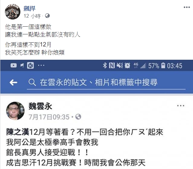 館長在臉書表示,高雄南霸天是第一個這樣公然挑戰,但他卻一點都不生氣的人,你再這樣不到12月,我笑死怎麼辦,也認為他不會參賽,直接叫魏陽陽身分證拿來,做比賽切結書,不然回家撒泡尿照照自己。