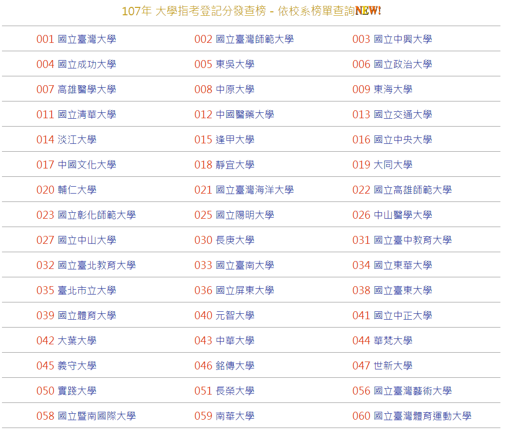 大學考試入學分發委員會今召開記者會表示,今年登記人次前3名的校系,社會組有中興大學財務金融系、中央大學財務金融系、台北大學企業管理系;自然組前三名為中央大學資訊工程系、中央大學電機工程系、成功大學資訊工程系,其中最高的是中興財金,登記人次高達6014人。