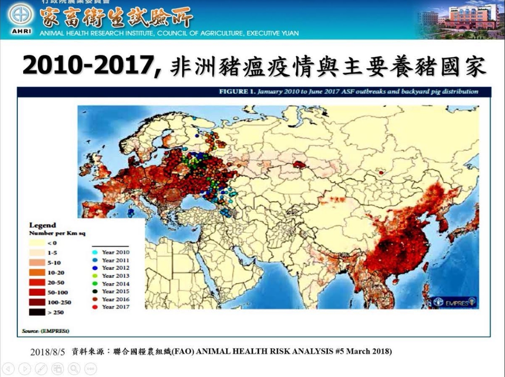 農委會表示,非洲豬瘟是由病毒所感染家豬及野豬的急性、惡性傳染病,無論任何品種或年齡的豬,均可能感染,急性感染發病率及死亡率高達100%。該病首先流傳於非洲各國,後傳至歐洲,近年來在俄羅斯和東歐國家持續流行,中國大陸為首次爆發。傳播途徑包括透過廚餘、直接接觸病豬或汙染物,或被帶毒的節肢動物叮咬後而感染。