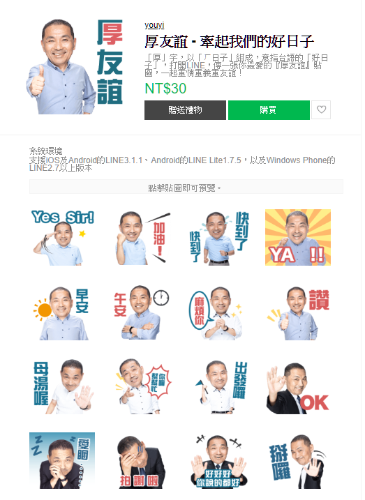 為了拉近和選民的距離,各候選陣營不但要拼政見,還得花心思比創意,除了臉書、IG、LINE傳遞即時訊息,最近有網友發現侯友宜推出專屬的「厚友誼」人像LINE貼圖,有基本的問候語,也有時下流行語,侯辦表示,貼圖其實是侯友宜支持者設計的,希望讓大家看到更可愛活潑的侯友宜。