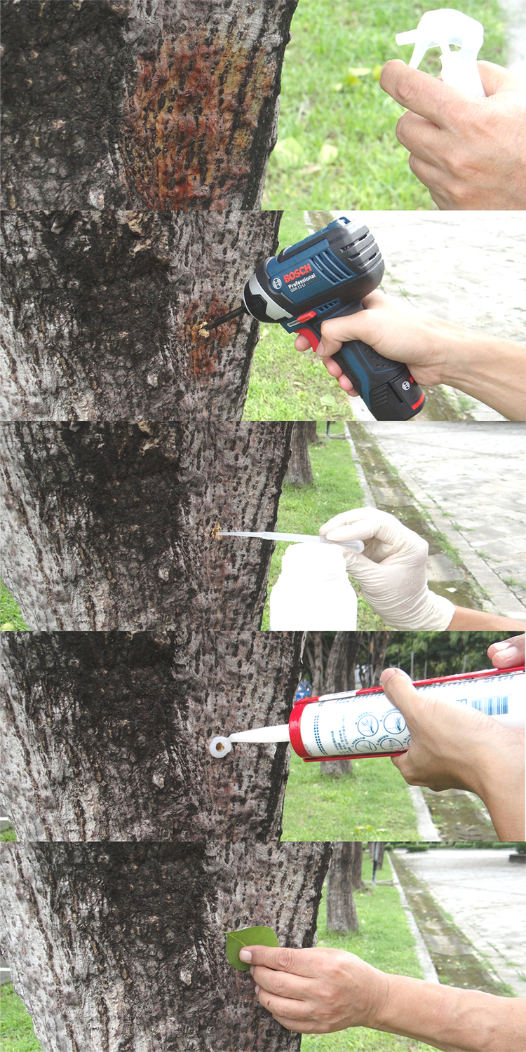 興大植醫院長唐立正表示,此次醫治的133棵樹,包含松竹路103棵、惠來公園12棵樹與國光(228公園)18棵,採用的「樹幹注射法」,以注射益達胺液劑為治療重點,藥劑可透過樹木的蒸散及傳導作用帶至葉片組織中,藥效可達1年。