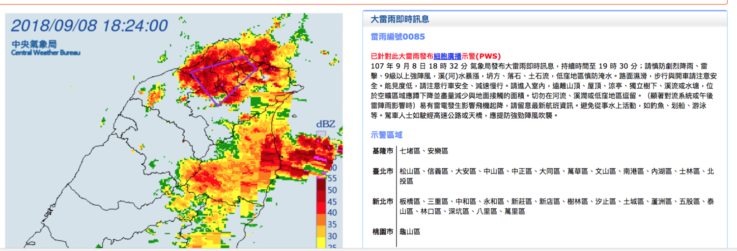 107 年 9 月 8 日 18 時 32 分 氣象局發布大雷雨即時訊息。 圖:中央氣象局提供