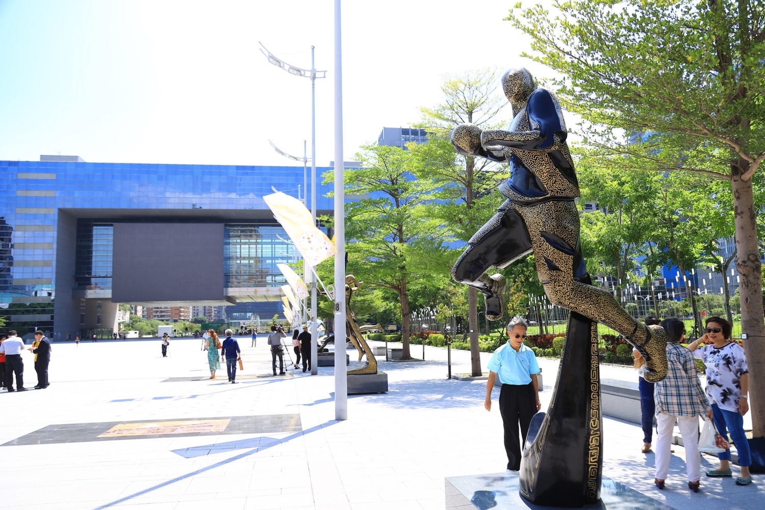 2019東亞青年運動會雖遭東亞奧林匹克委員會取消台中市主辦權,但籌辦過程有4位雕塑家在10家企業、公會支持下捐贈12件雕塑作品給台中市政府,市府將雕塑品展示於台灣大道市府廣場,今天由台中市長林佳龍與行政院政務委員張景森共同揭幕。