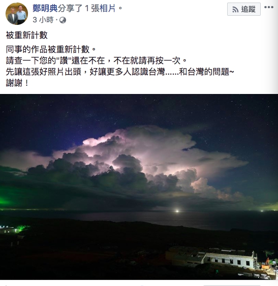 對此,氣象局副局長鄭明典在臉書表示,同事的作品被重新記數,請查一下您的讚還在不在,不在的話就請再按一次,先讓這張好照片出頭,好讓更多人認識台灣和台灣的問題,謝謝!