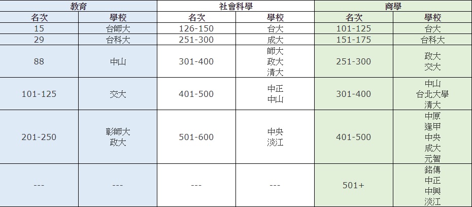 台師大過去在QS教育學科排名表現亮眼,連續5年穩居全球前50名,近年THE為了確實評比全球大學在各領域的表現,進一步劃分更多的評比領域,例如教育、法律領域原屬社會科學領域範疇,從去年首度成為獨立受評的領域。