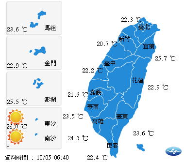 今(5)日各地氣溫方面,北部20至28度,中部20至30度,東部23至31度,南部21至31度,外島金馬澎湖22至31度。