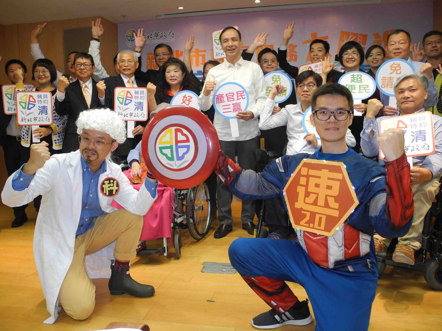 市府上午開記者會,邀長輩、身障團體、輔具業者代表到場,另以超人行動劇詮釋「輔具超音速2.0」版的簡便。市長朱立倫說,「輔具超音速2.0」讓民眾省去自行填表申請補助款的30天等待期,只要經核定後,即日起購買輔具時不必再先全額自付,也免檢附證明文件向市府請領補助款,意即向特約廠商購買或租賃時,僅須依規定支付部分負擔(即自付額0-30%),就能取得輔具,補助款則由特約廠商統一請領。