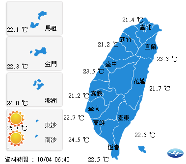 氣溫方面,北部21至26度,中部21至30度,東部22至31度,南部22至32度,外島金馬澎湖22至30度。