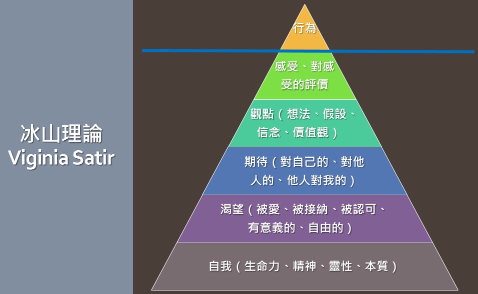 無獨有偶的,家族治療的先驅Virginia Satir提出的冰山理論中,以冰山浮出水面的一小部分,來形容人的外在行為(如反駁、拒絕等等),行為底下仍藏有感受、觀點、期待和渴望等要素,如同前段提及的溝通模式一樣,一段溝通中潛藏著雙方在成長經驗中累積而來的深層渴望(如被認可、做的決定有意義)、對自己和他人的期待(希望能表現好、希望他人贊同),逐步影響了自身的價值觀和對話時的感受,最後形成外在行為。因此,要提升溝通的成效,除了聚焦在客觀事物的意見交換外,增進雙方的了解、看到彼此的內在需求,亦是相當有效的。