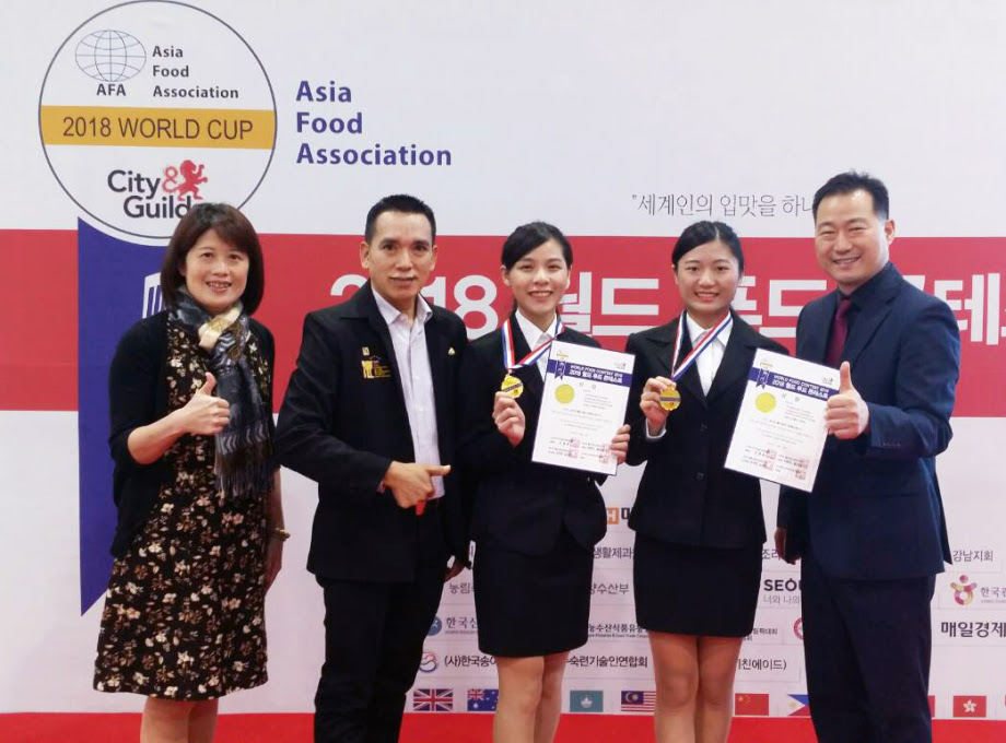 龍華科技大學觀光休閒系學生許智婷及蕭韻純,由謝美婷老師帶領,參加2018 AFA 韓國世界廚藝大賽,在經典調酒組項目分別以第一及第二高分,雙雙榮獲金牌獎殊榮,為台灣及龍華學子爭光。