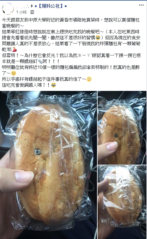 PO文的網友表示,原本是陪朋友去中原大學附近的黃昏市場買菜,在麵包攤上買了這顆俗稱「炸彈麵包」的麵包想當晚餐。她說,自己吃東西前有個壞習慣,就是喜歡先看看或是聞一聞,以免吃到過期或是有問題的食品;剛開始她看到麵包上的螺絲釘還以為是一顆葡萄乾,但是仔細檢視,卻發現這顆葡萄乾居然會反光,才驚覺是一顆螺絲釘。女網友大嘆,攤位上有差不多10顆炸彈麵包,偏偏她就挑到這顆有螺絲釘的。