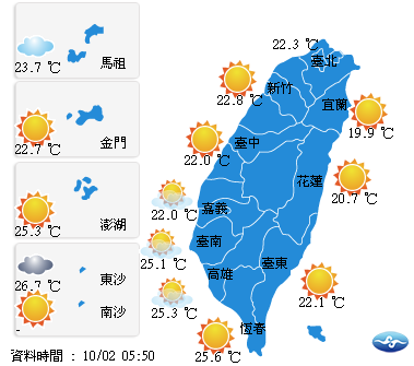氣溫方面,北部20至29度,中部21至32度,東部20至29度,南部23至30度,外島金馬澎湖23至29度。