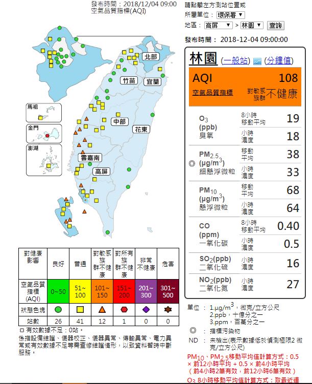 西半部地區風速較弱,擴散條件較差,12測站發布橘警。 圖:截自空氣品質監測網