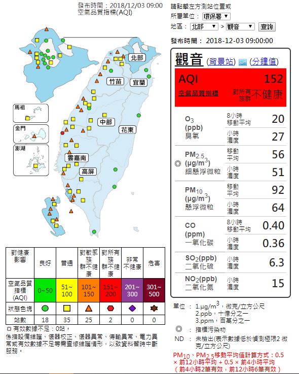 中央氣象局表示,西半部地區風速偏弱污染物濃度易累積,觀音、台西兩側站發布紅害警戒。 圖:截自空氣品質監測網