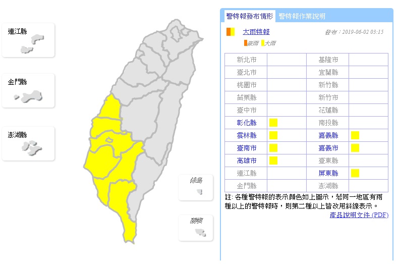 對流雲系發展旺盛,易有短時強降雨,大雨特報範圍包括彰化縣、雲林縣、嘉義縣市、台南市、高雄市及屏東縣,提醒民眾注意