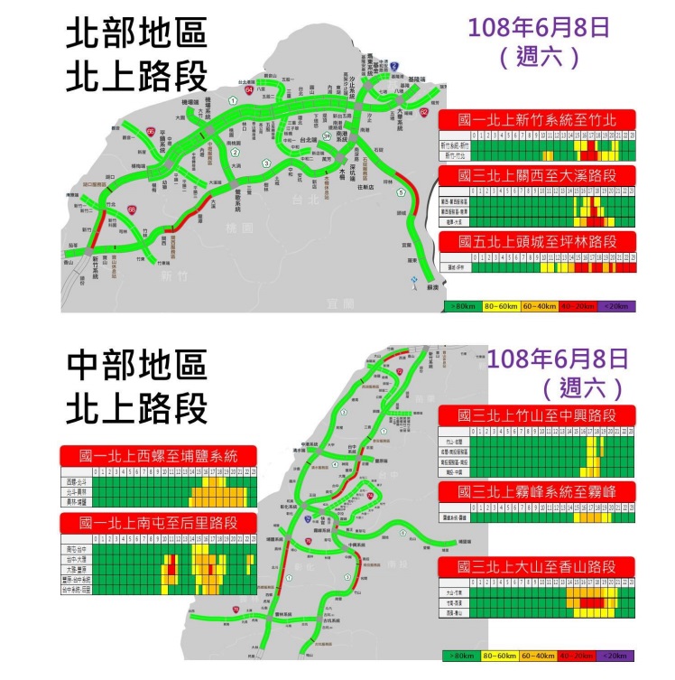 高公局表示,今天國道雙向預估有14大地雷易塞路段,南下包括國1楊梅到新竹、彰化到埔鹽系統,國3三鶯到關西、烏日到霧峰,以及國5南港系統到坪林;北上則包括國1西螺到埔鹽系統、南屯到后里、新竹系統到竹北,國3關西到大溪、大山到香山、竹山到中興、霧峰系統到霧峰,以及國5頭城到坪林和國6舊正到霧峰系統,行車時間為平常3倍到7倍,其中國5北上頭城到坪林最塞,開車恐要7倍時間。