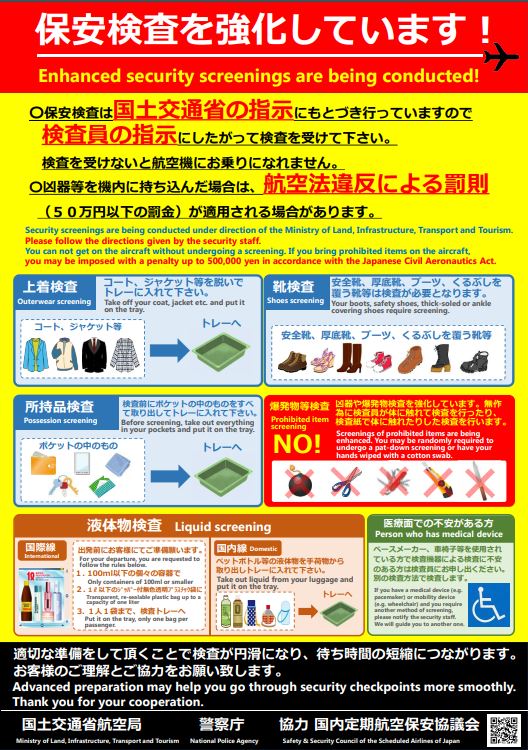 因應2019世界盃橄欖球賽、2020年奧林匹克運動會及殘障奧林匹克運動會都將於日本舉行,日本官方將會強化國內線與國際線飛機的安全檢查,主要針對事項為加強檢查外套、鞋子及爆炸物,且這些規定從2019年9月13日起永久實施。