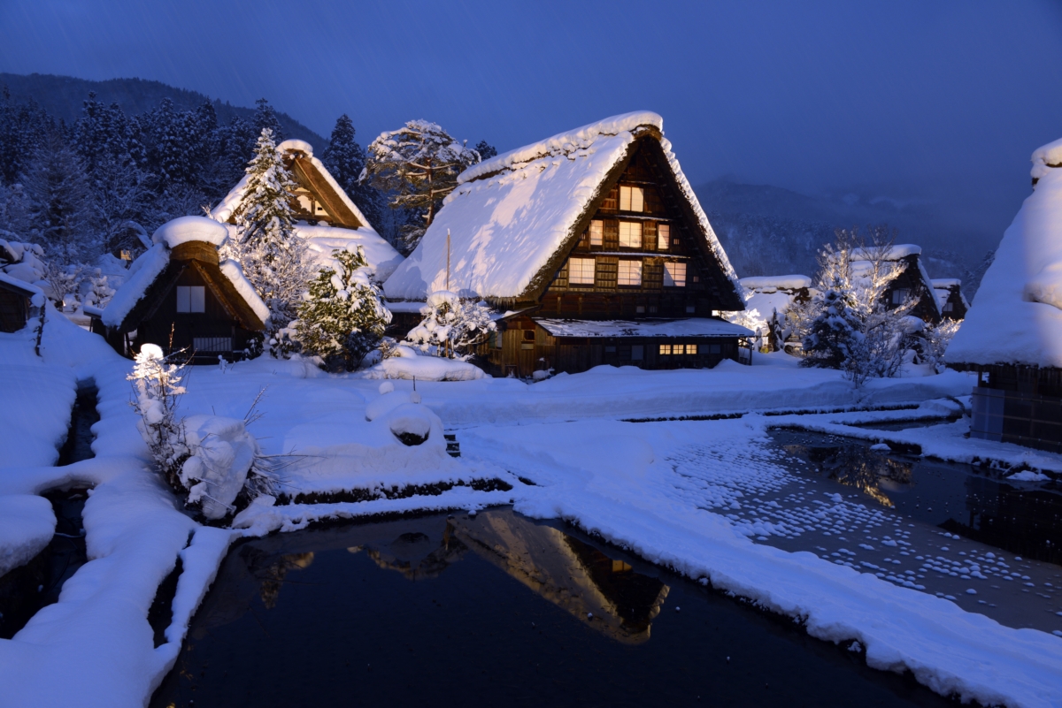 白川鄉合掌村保存日本古代「合掌造」建築,宛如雙手合掌造型的木屋,建造過程沒有使用任何一根釘子,屋頂鋪上茶色茅草,歷史可追溯到300年前。因其稀有性和歷史意義,在1995被列為世界遺產。每年冬季點燈是白川鄉合掌村盛事,大雪紛飛,將地面與屋頂染成白色,一棟一棟的屋舍在冷色調的大地中發出暖黃微光,總吸引大批遊客特別前來欣賞。